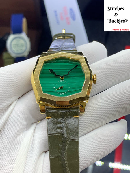 The watch features the iconic case shape of the past in gold color with a Malachite gemstone dial, complemented by a fully brushed bezel and gold colored hands.