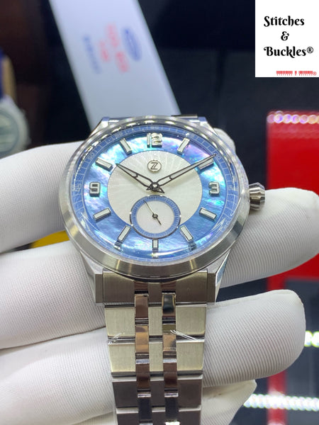 An intricate dial crafted from MOP with engraved guilloché textures, producing depth and contrast that evolve as light moves across it