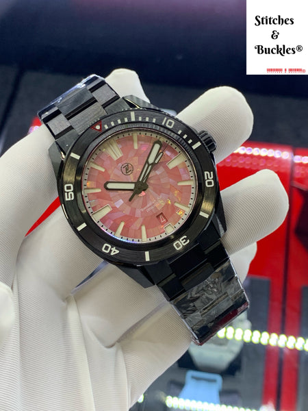 DLC Case and bracelet with Red/Pink MOP Mosaic Dial. BGW9 lumed hands, bezel and indices